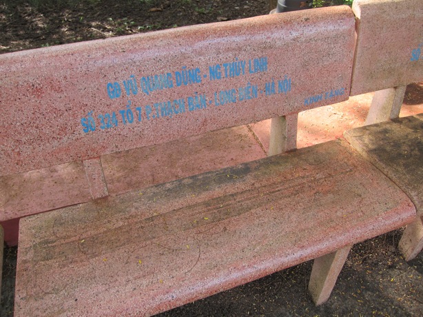 日本でも神社などで個人名や企業名が彫られた石柱がありますが、ベトナムはベンチらしい。