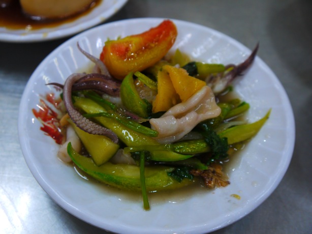 頭 の写真から、トマトとネギが入った卵焼き、豚の角煮と煮玉子、ゴーヤの玉子炒め、イカとトマトとウリとパイナップルの甘酸っぱい炒めもの、そして肉団子の トマトソース煮です。はい、頼みすぎ。Minh Đứcはそのメニューの豊富さからついつい頼み過ぎちゃう。ちなみにmang về(持ち帰り)可能だよ!