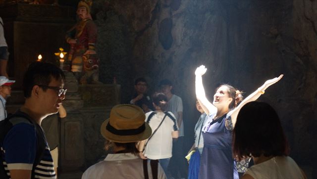 この洞窟がある場所は、ベトナム中部の都市・ダナンの郊外にある五行山。大理石からできている山で、お寺も多く建てられています。今ではダナン有数の観光地となり、中でも数あるうちのひとつの洞窟「Dong Hoa Nghiem(花園洞窟)」は、正午あたりに行くとこのような光の柱が出現することで知られています。友人は先輩から「FFみたいな洞窟」と言われていたそうです、なるほど。