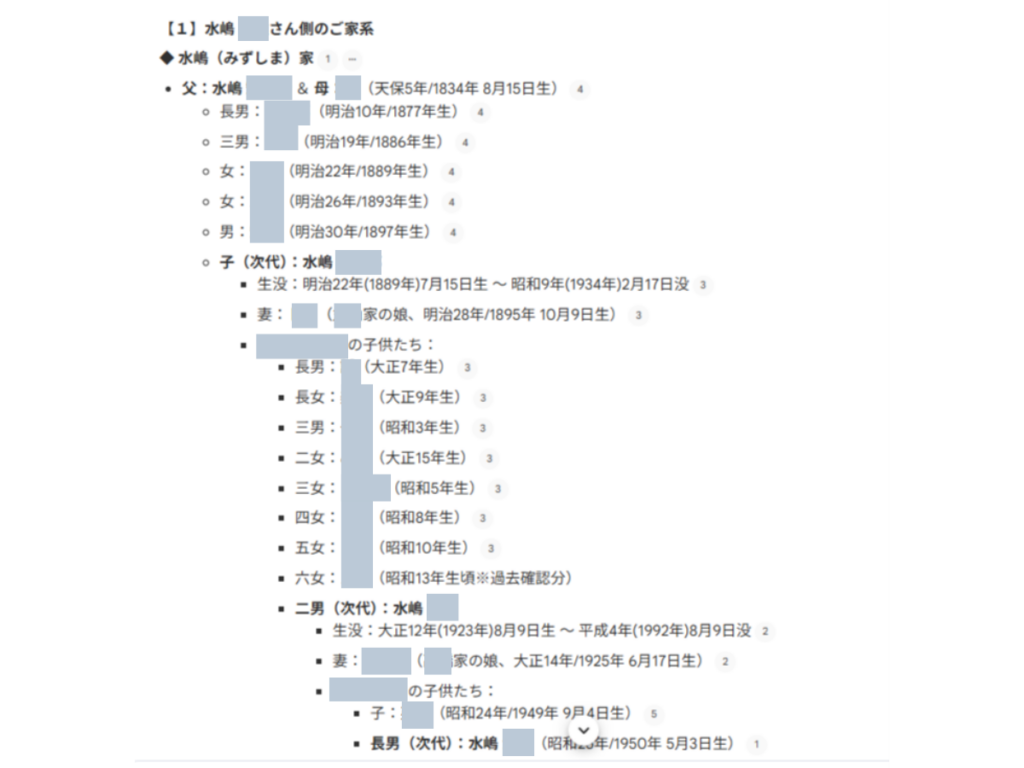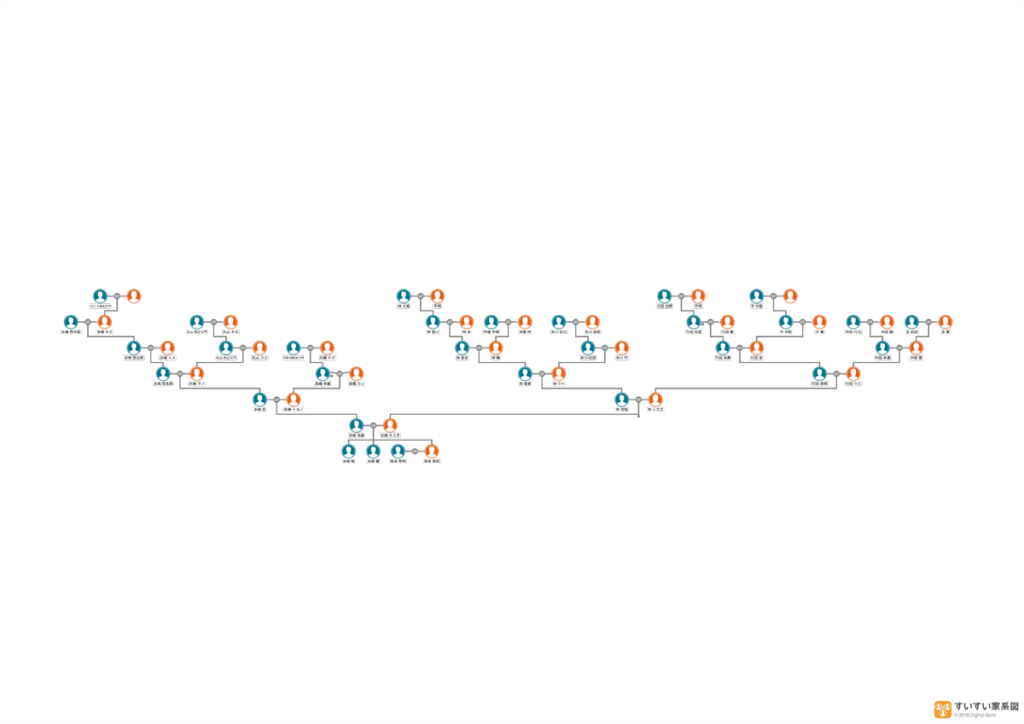 こうして階層ごとに名前を羅列した情報さえ出せれば、あとはそれを家系図に起こしていって、そのタイミングで戸籍と照らし合わせて名前を修正していきます。なお、家系図作成で定番アプリの「すいすい家系図」さんを使用しました。