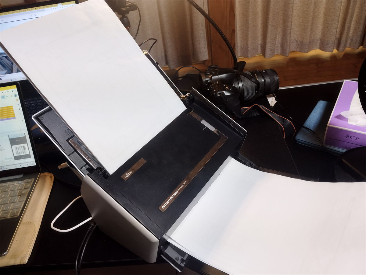 取得した戸籍は紙の束なので、まずはデータ化する必要があります。自宅のスキャナーを使って一枚ずつスキャンしていきました(周りがガチャガチャしているのはスルーしてください)。偽造防止のためか、スキャンするとデータ上では戸籍に「複写」という透かしが入りますが、肝心の文字自体は全然読めるので気にせずガンガン続けていきます。
