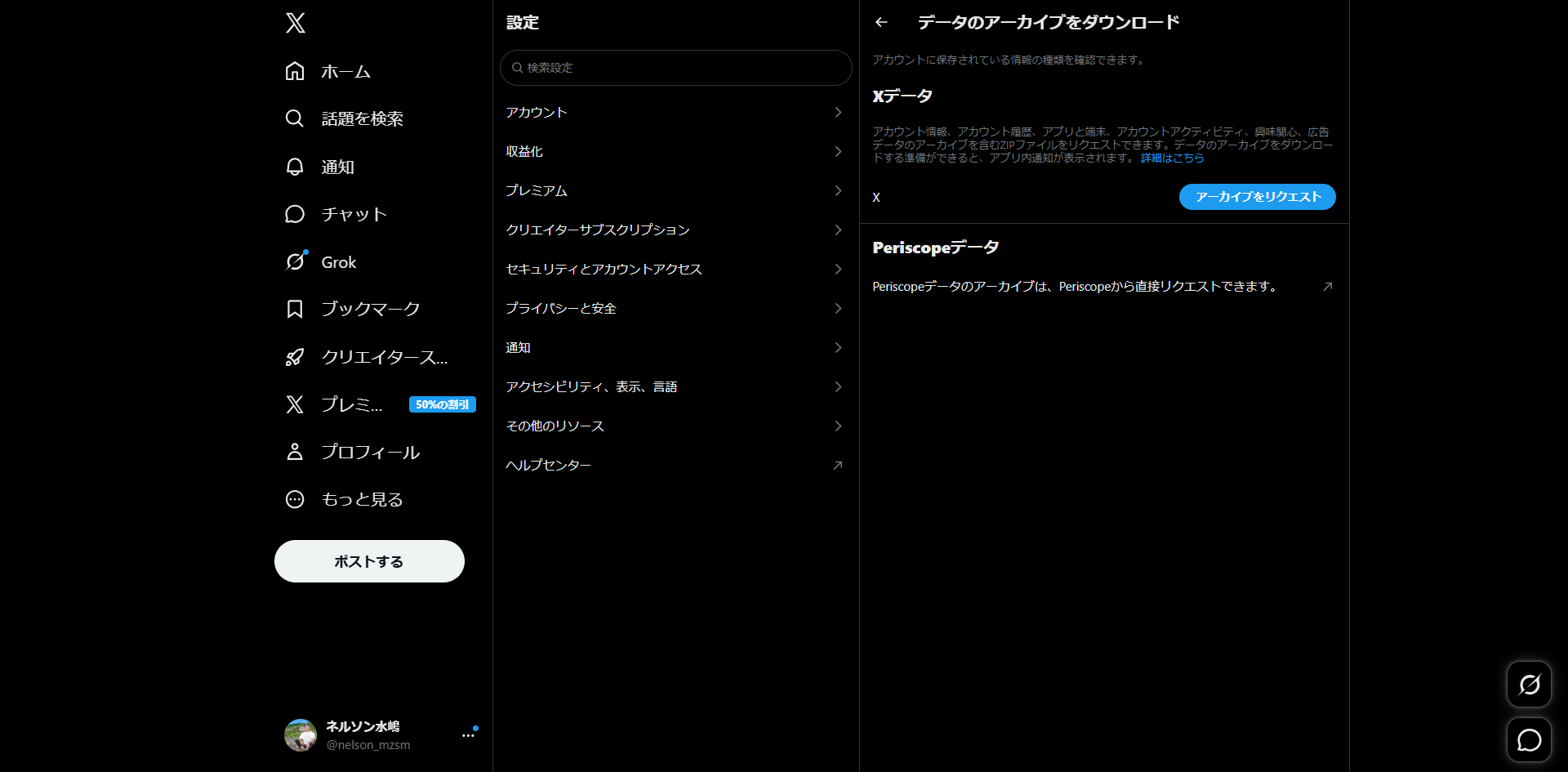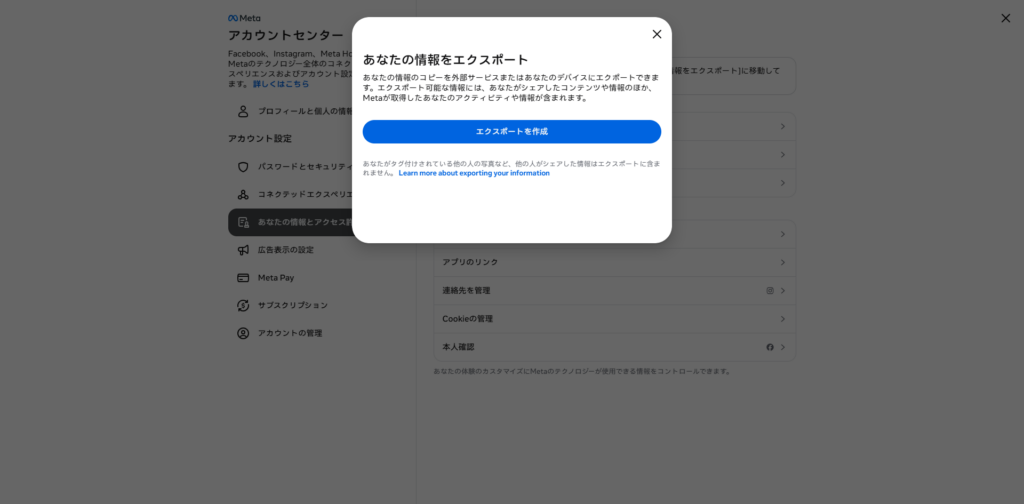InstagramとFacebookは同じメタ社が運営しているので、Facebookのアカウントセンターの設定からいろいろとリクエストできます。Xの方も同じく、設定画面からリクエストが可能です。当たり前ですが、対象にはTwitter時代の投稿も含まれています。