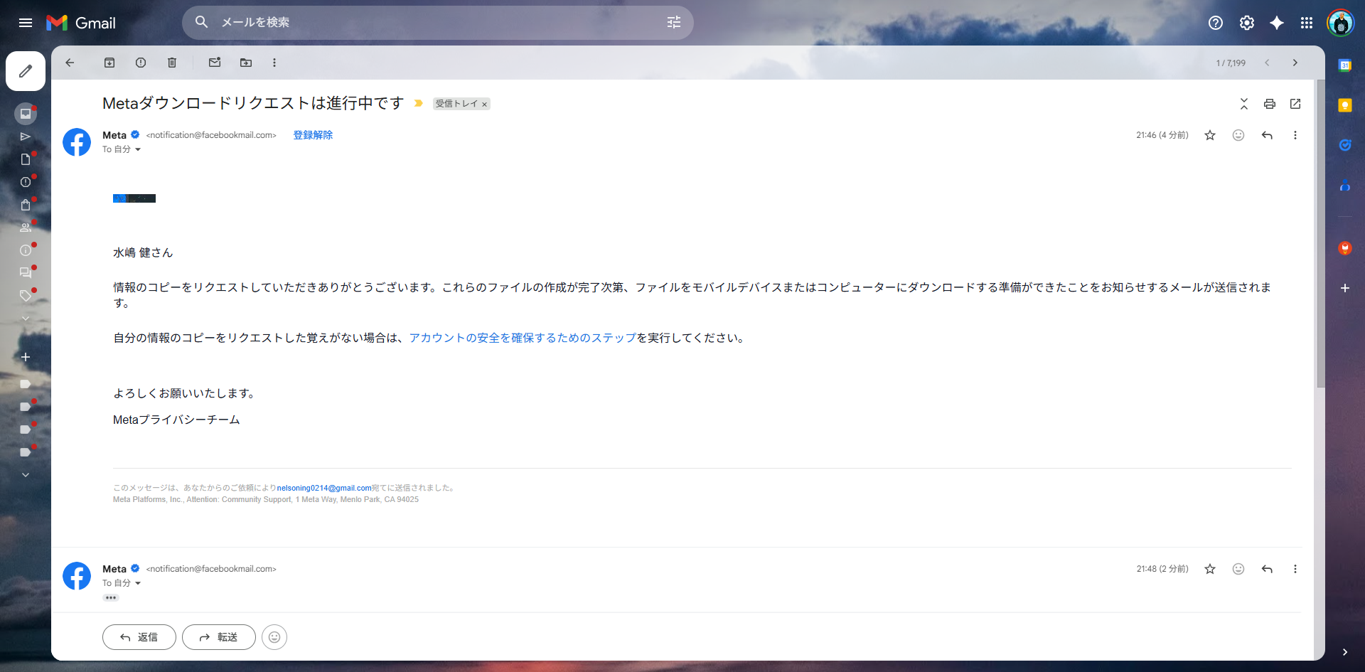 ただ、ここでちょっとしたポイントが。リクエストボタンを押して「ハイ、すぐダウンロード!」とはいきません。 投稿量にもよりますが、私のように17年間も垂れ流し続けていると、データの準備ができるまでに1〜2日はかかります。リクエストを受け付けたというメールが来て、そのうち「ダウンロードできるようになりました」と通知が来ます。