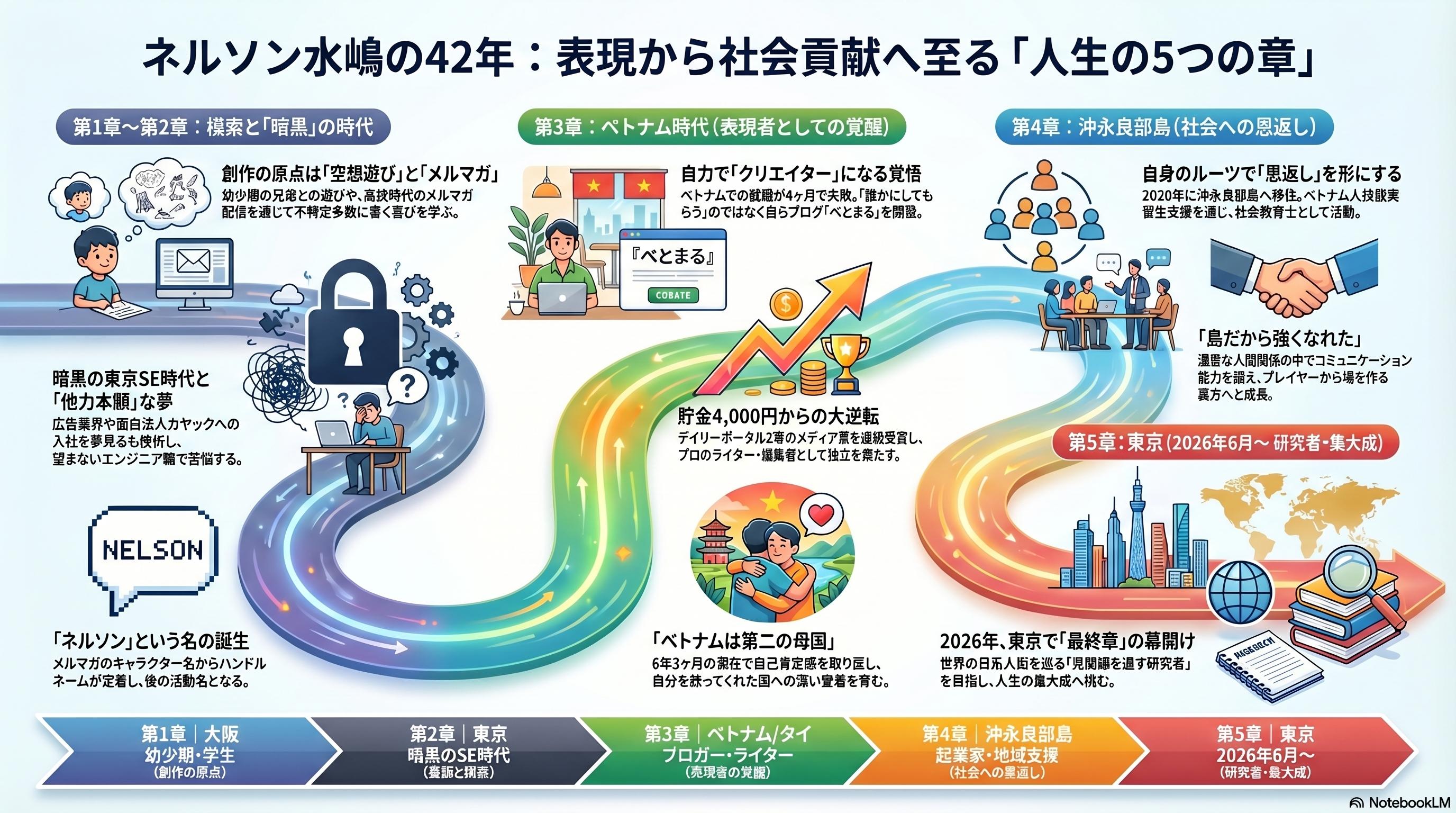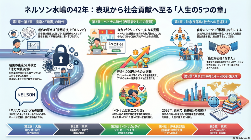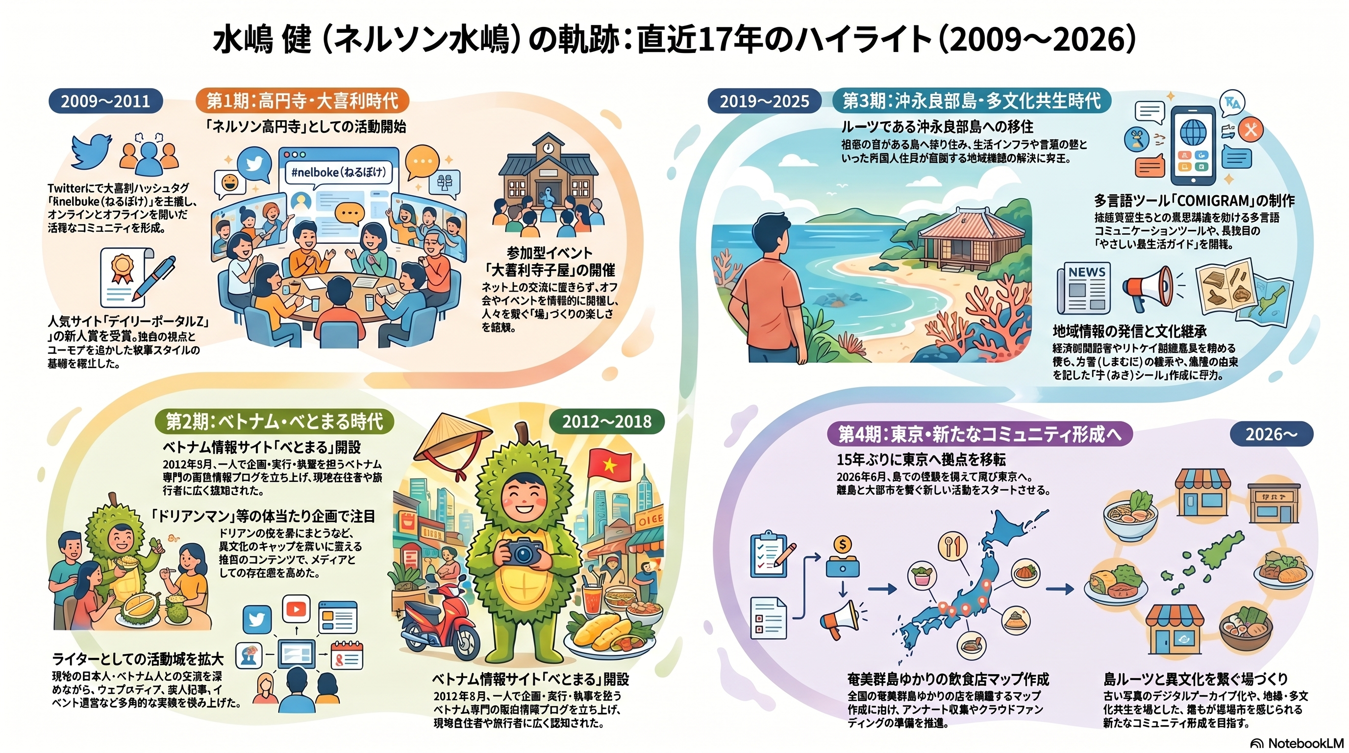 全体として、一人の人物が「ネットのお笑い(大喜利)」から始まり、「海外(ベトナム)」での生活を経て、「自身のルーツ(沖永良部島)」での地域活動や社会課題(多文化共生)の解決へと活動の幅を広げ、深めていく人生の軌跡が詰まった内容となっています,。